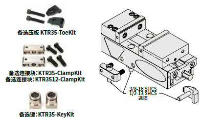 多功能鉗型號:KTR35該多功能鉗可以用在任何小臺面的機床上,加上絲杠的外六角總 體長度只有257.175mm和9.07kg重量。鉗口寬度88.138mm,張開 度96.774mm,使用鉗口的臺階時張開度為105.664mm。帶有防 屑板??梢酝ㄟ^鉗身上的孔或者單獨購買的壓板固定虎鉗。各個 側(cè)面均磨削加工,方便各種方向使用。兩個端面有四個適于壓板 的空腔。當(dāng)另外使用一臺母鉗時該鉗可以作為正弦鉗使用,依靠 鉗身上的自身定位孔實現(xiàn)30°、45°和60°的角度加工(注:鉗身上加 工這三個角度是客戶選項,請聯(lián)系我們報價)。當(dāng)使用正弦鉗功能 時,只需要把鉗身側(cè)面的磁力貼片揭下,并使用定位銷即可。特點: